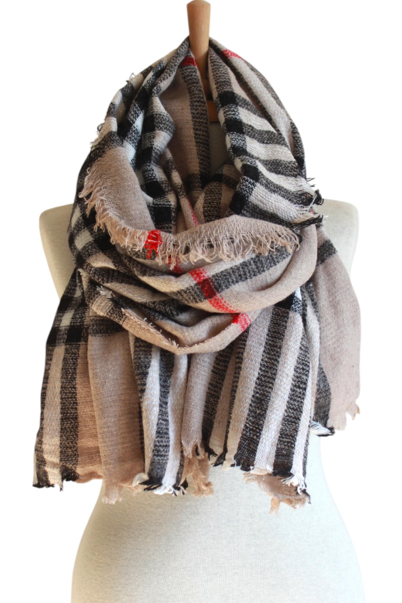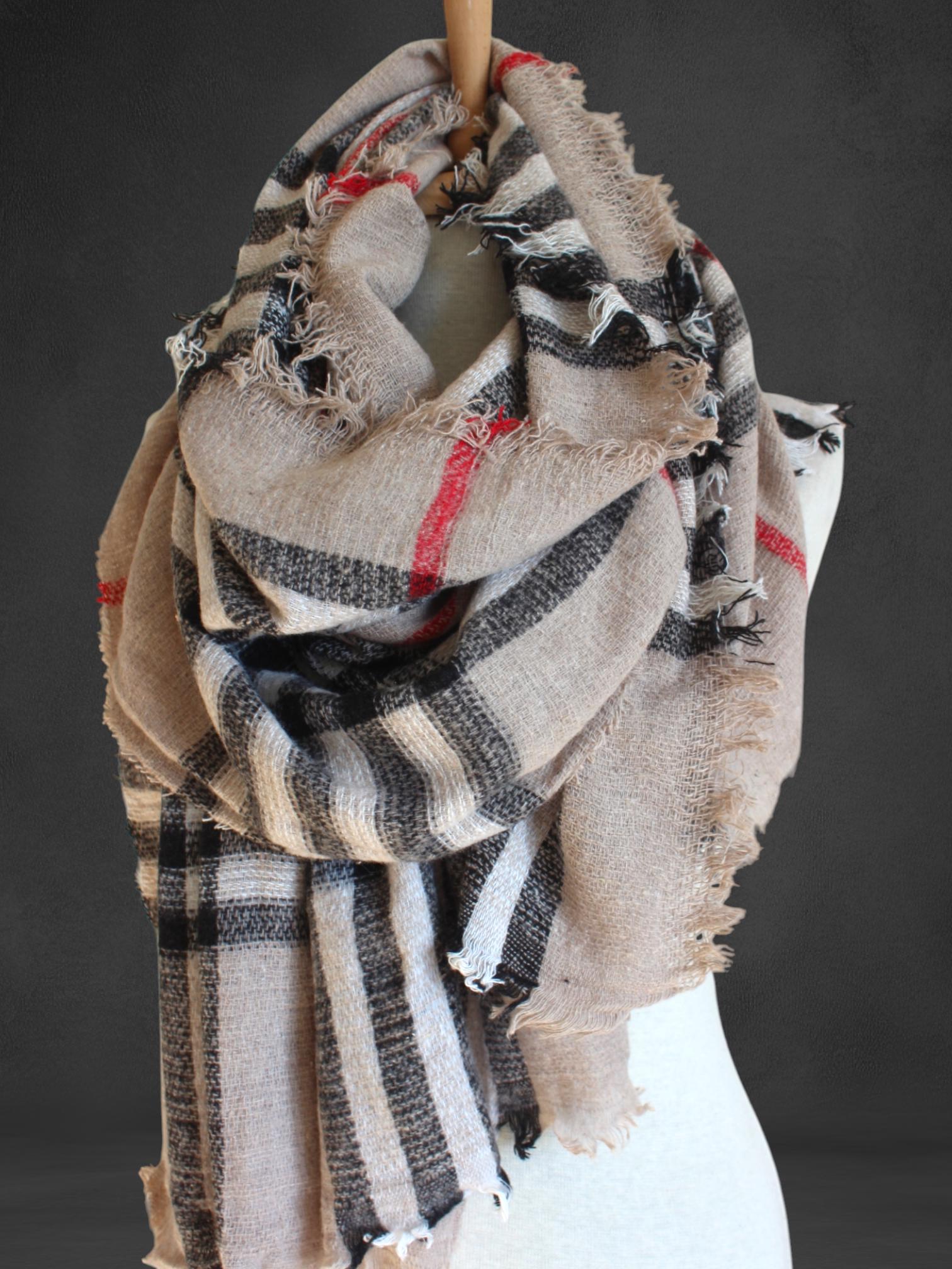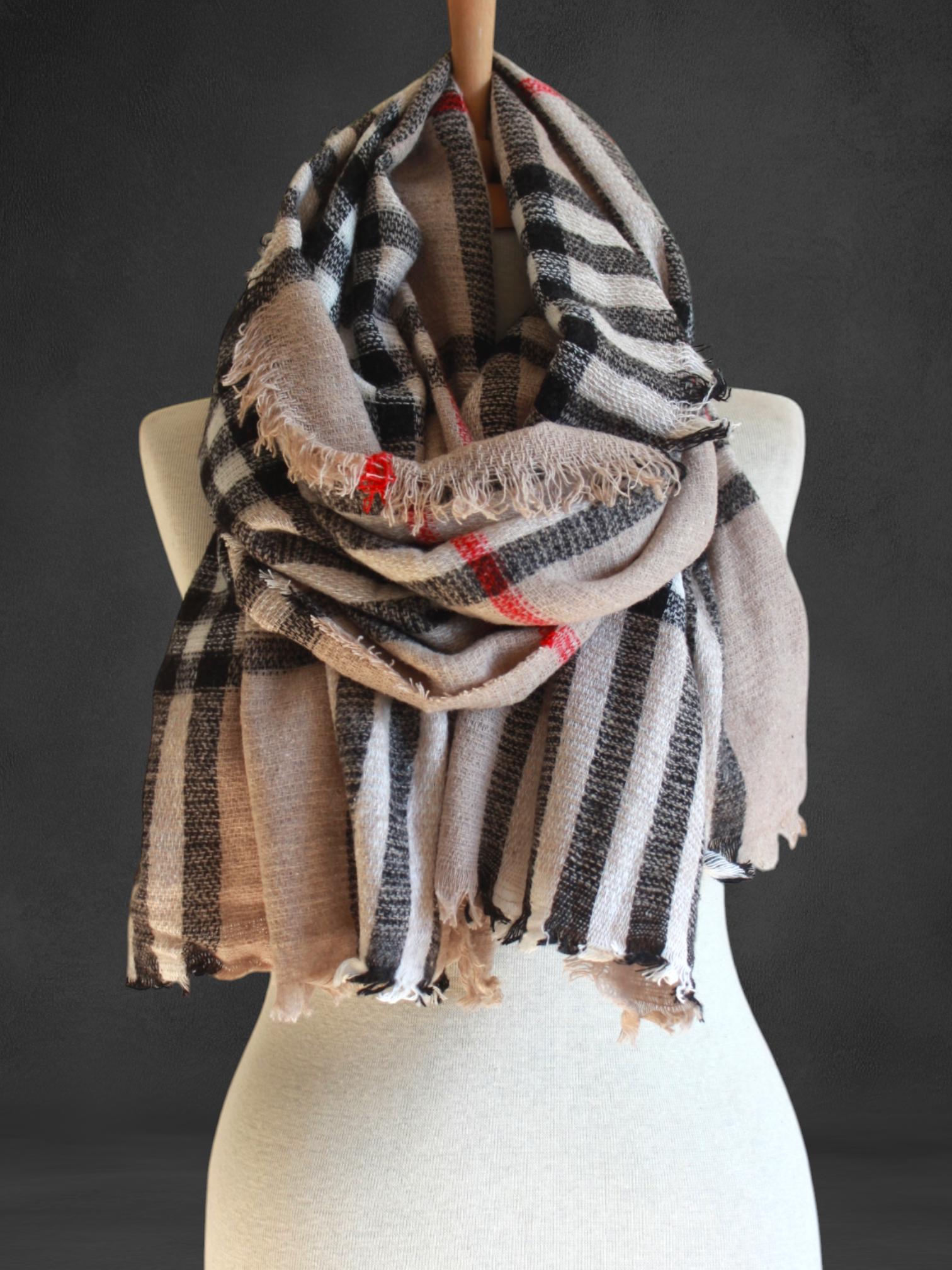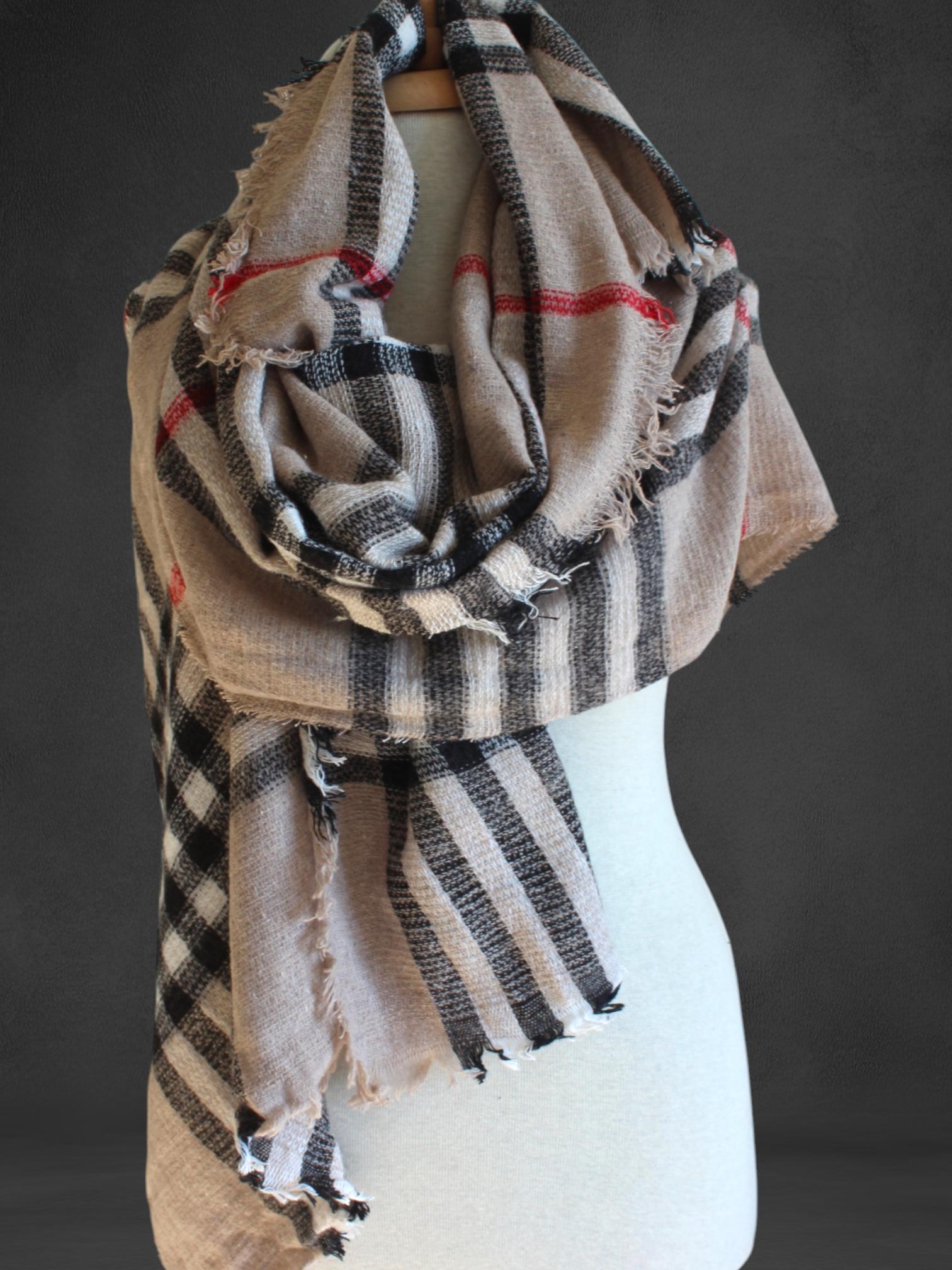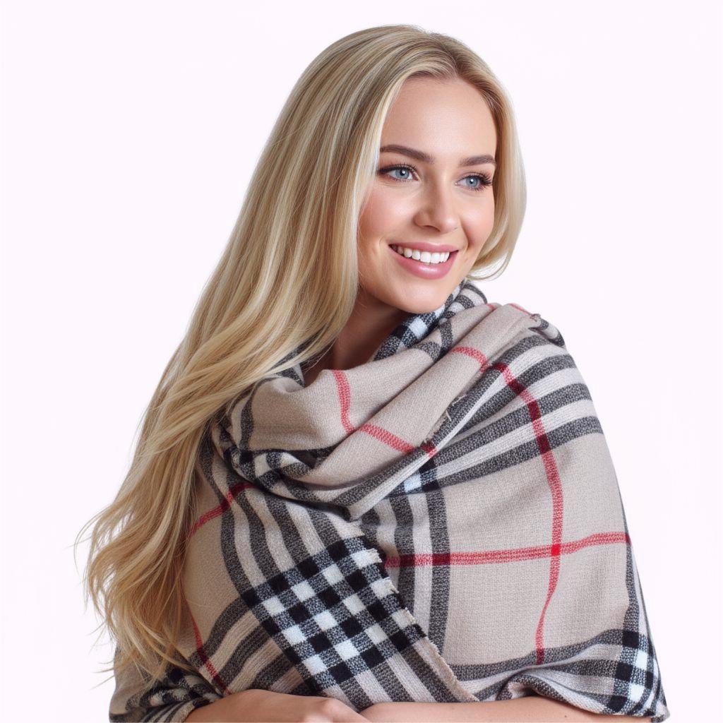 Stay warm in classic style with this beige plaid blanket scarf. Designed with a timeless tartan check pattern (neutral beige with black/white checks and subtle red lines), it offers a cozy, layered look that pairs effortlessly with coats, sweaters, and everyday outfits. Soft, warm, and easy to wrap—your go-to cold-weather essential.
