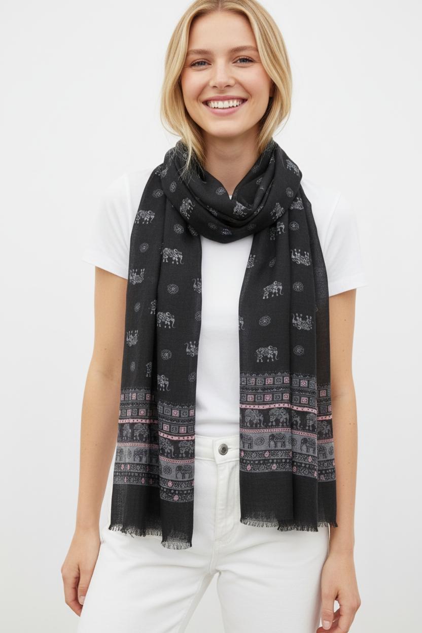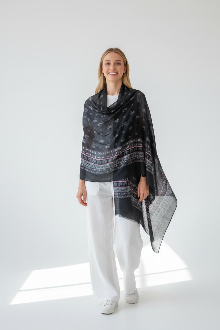Elevate your outfit with this black drapey shawl featuring subtle all-over motifs and a decorative boho border print. The airy, lightweight fabric flows beautifully over the shoulders, offering effortless coverage and a polished finish—perfect for daily wear, travel, and cool indoor spaces.