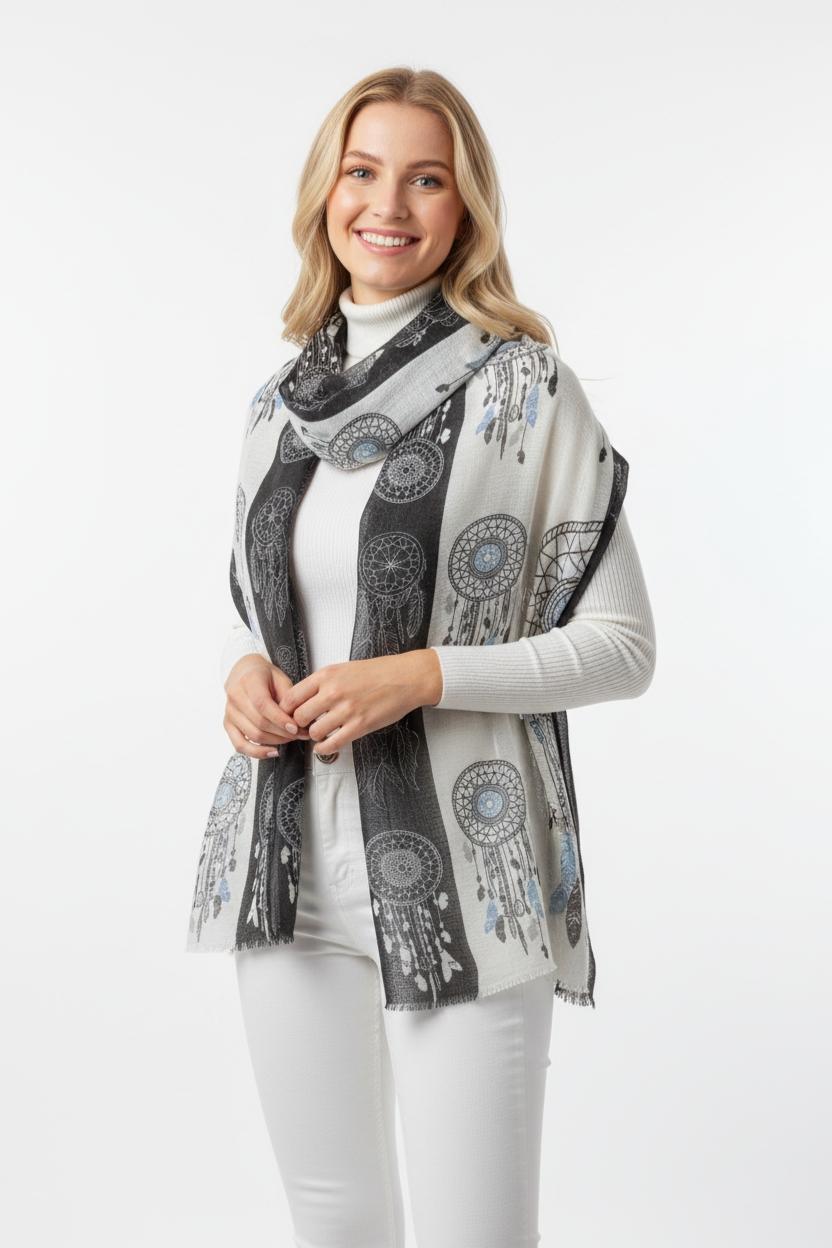 Add a bold, artistic finish to any outfit with this black and white dreamcatcher print shawl. Featuring detailed circular motifs and feather-inspired accents, it offers a modern boho look with an easy, flowing drape. Lightweight and breathable, it’s perfect for year-round layering—great for travel, daily wear, and cool indoor spaces.