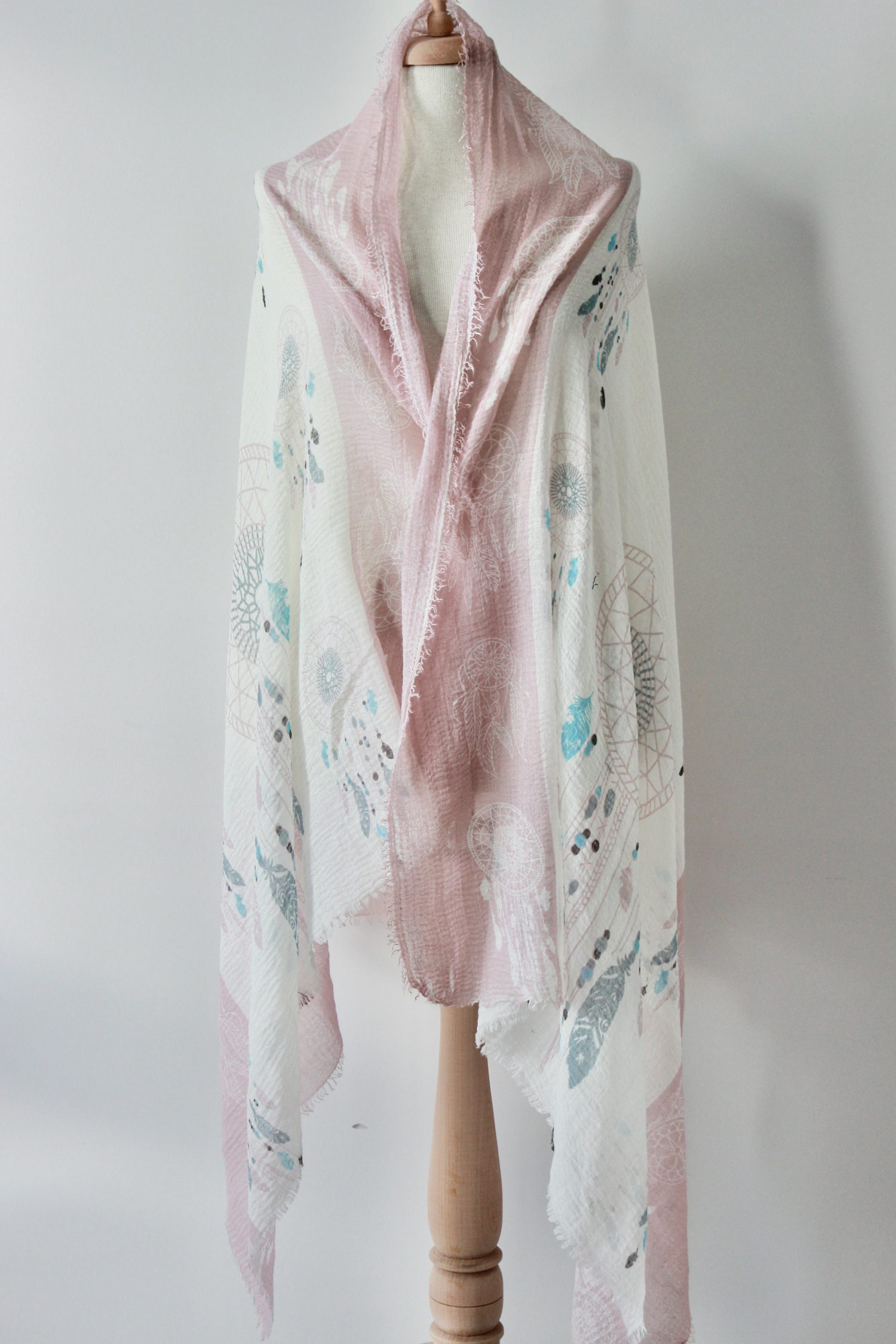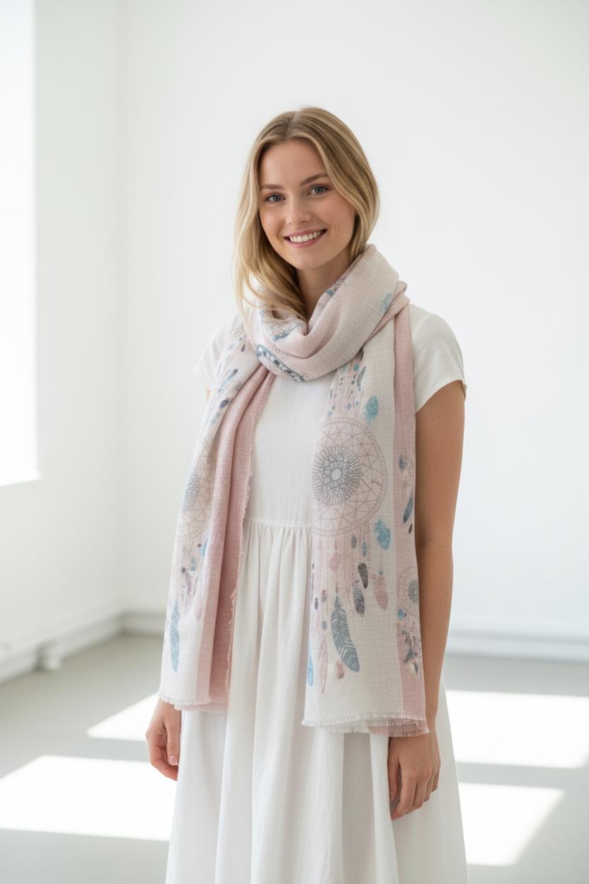Add a gentle, romantic touch to your look with this blush pink shawl featuring delicate dreamcatcher-inspired motifs and soft pastel accents. Lightweight and breathable with an easy drape, it’s the perfect finishing layer for daily wear, travel, and cool indoor spaces—effortless, feminine, and easy to match.