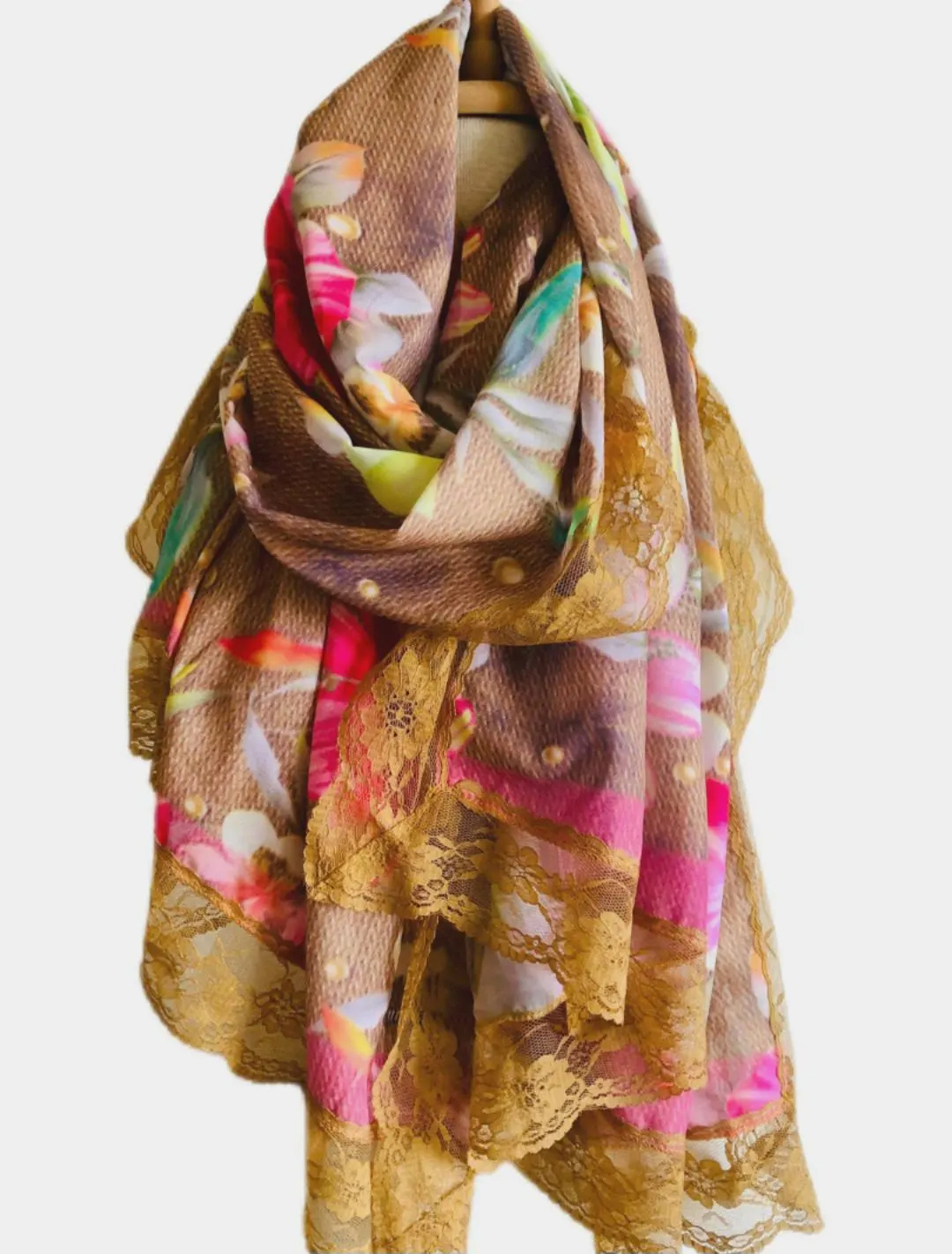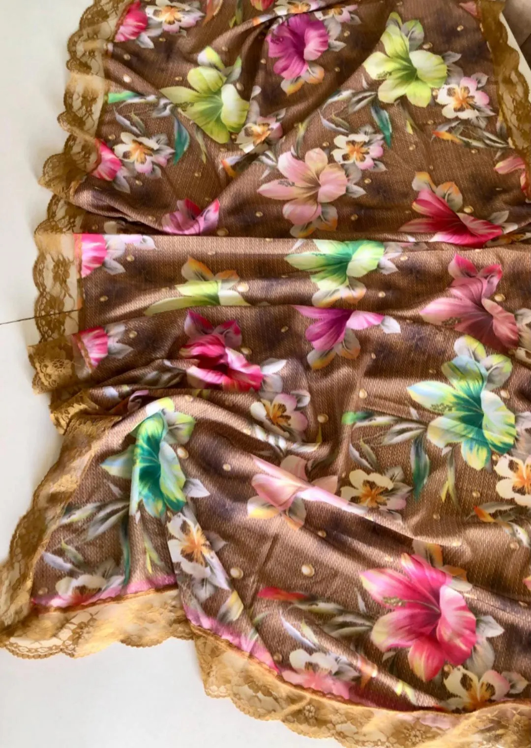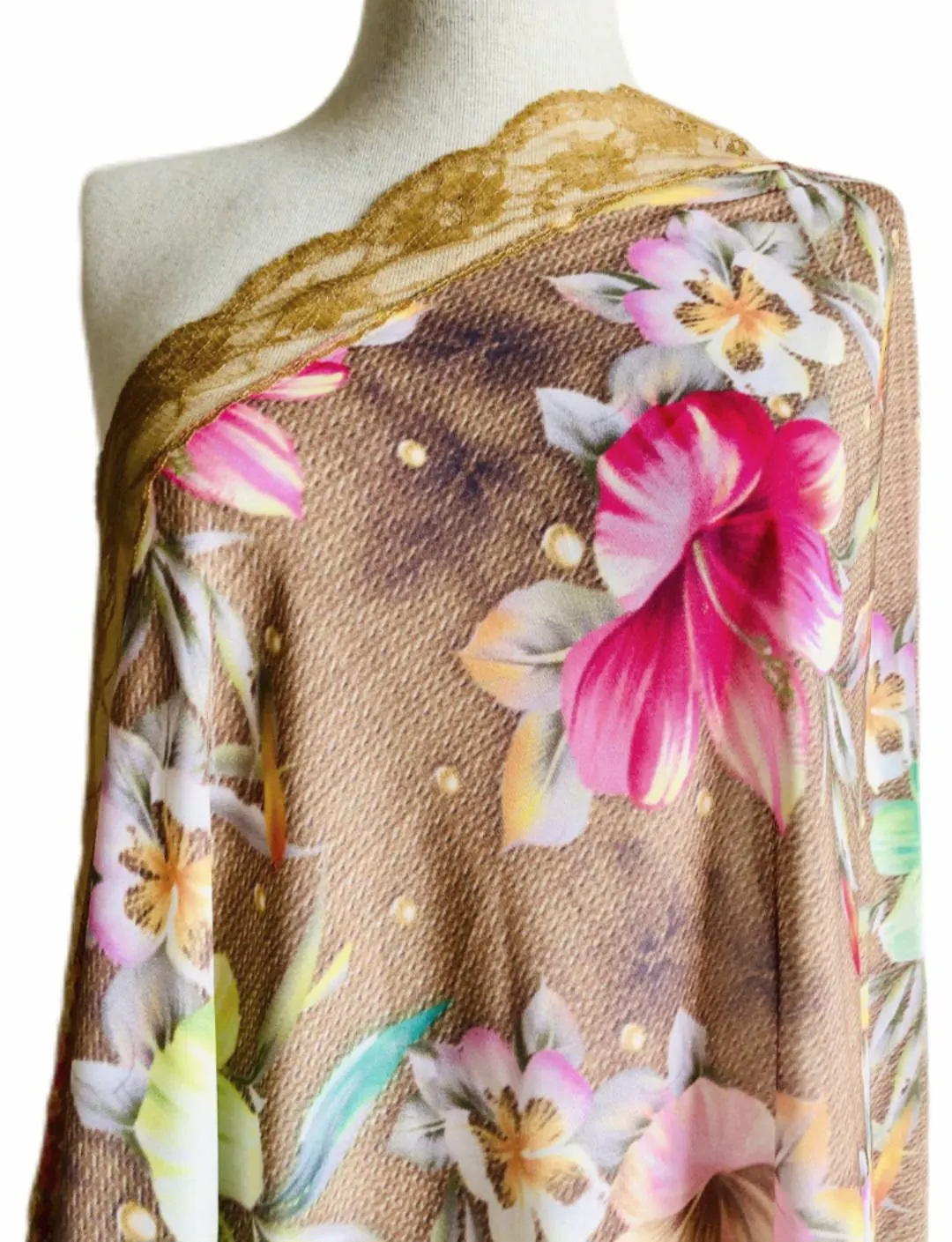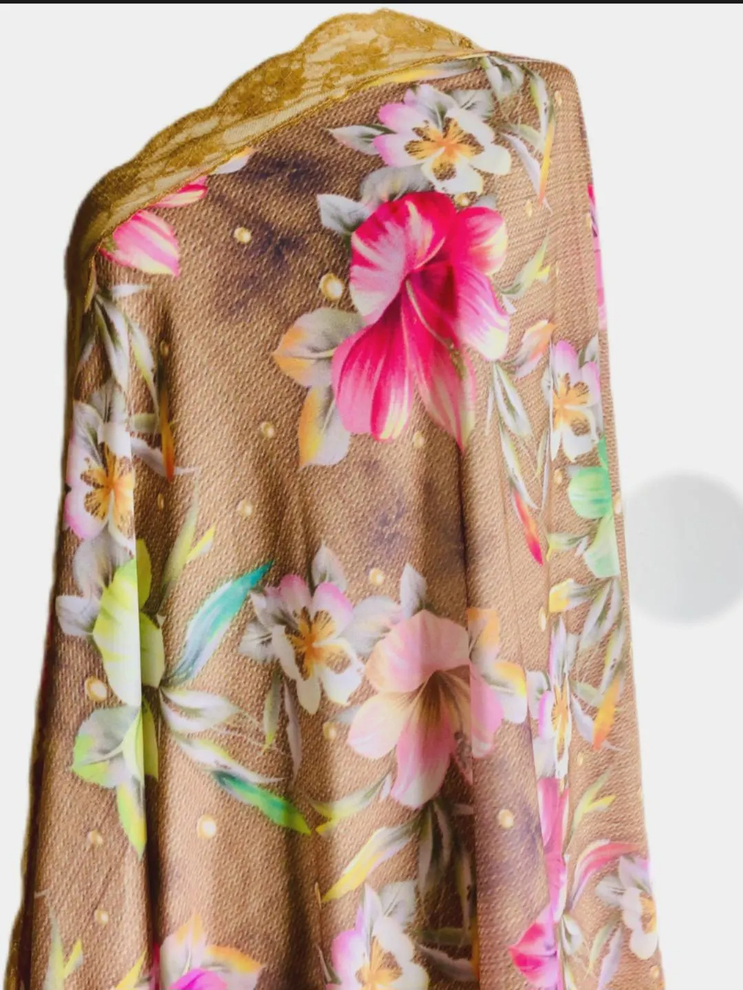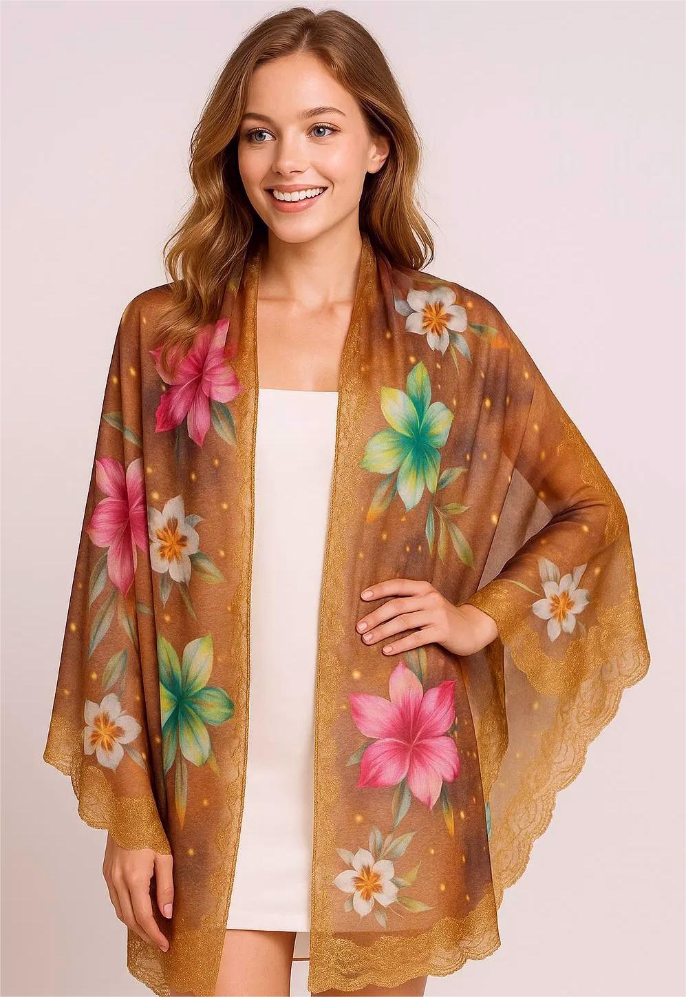 Elevate your warm-weather style with this brown floral kimono cover-up featuring vibrant tropical blooms and a soft, flowy drape. Designed with an open-front silhouette and a delicate scalloped hem, it’s the perfect throw-on layer for beach days, vacations, poolside lounging, and casual summer outfits.