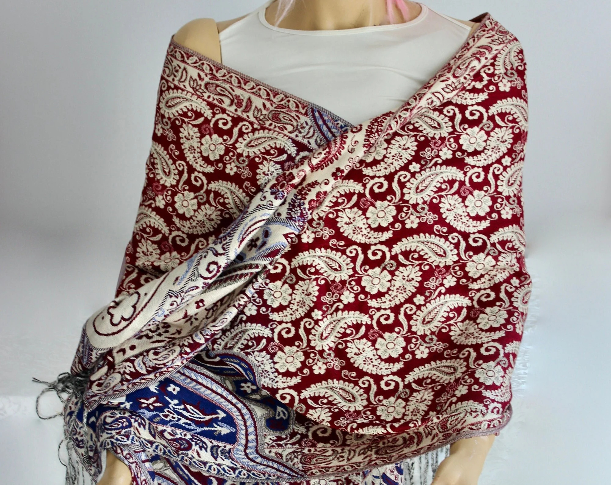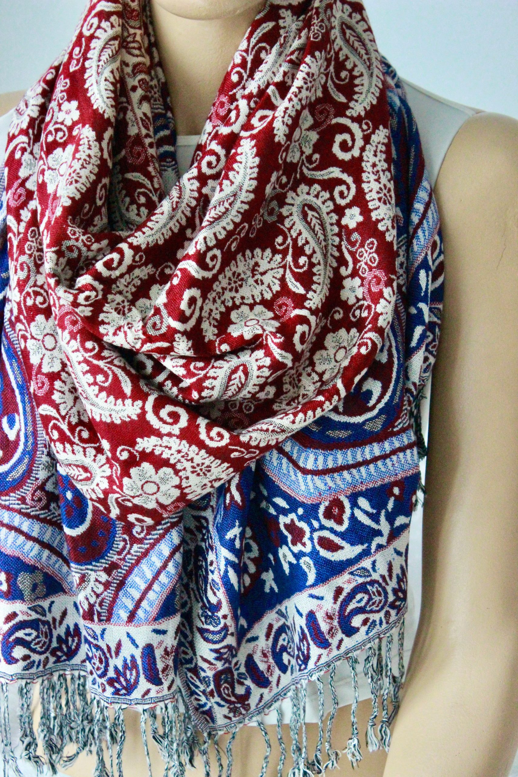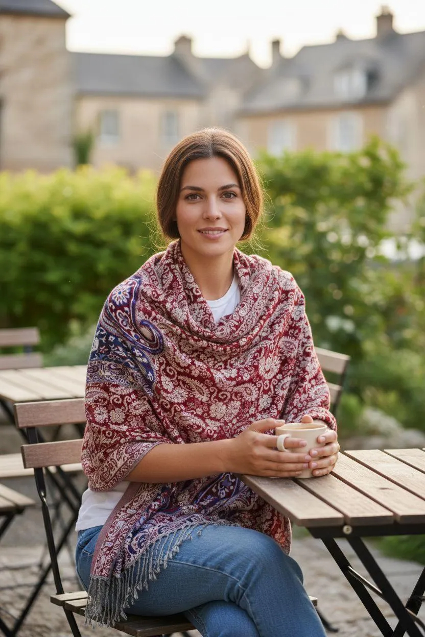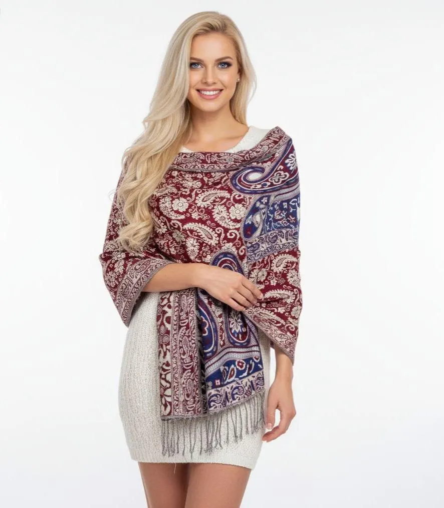 Add timeless elegance to your wardrobe with this burgundy paisley shawl featuring a rich jacquard-style woven pattern in deep red, navy, and cream tones. Finished with soft fringe tassels, it drapes beautifully over the shoulders for a polished look—perfect for everyday layering, travel, and special occasions.