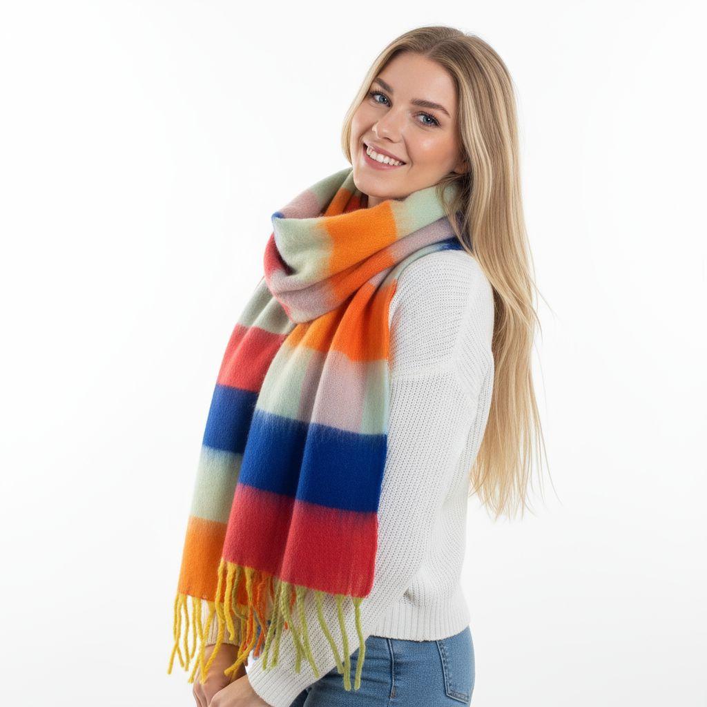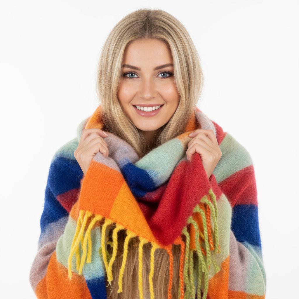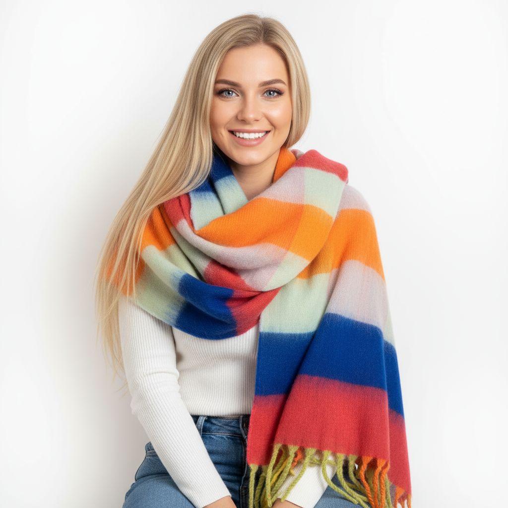 Brighten up cold-weather outfits with this bold multicolor striped blanket scarf. Featuring wide, vibrant color blocks and a soft, cozy drape, it delivers instant warmth and statement style. Finished with fringe tassels for a classic blanket-scarf look—perfect for fall, winter, travel, and gifting.