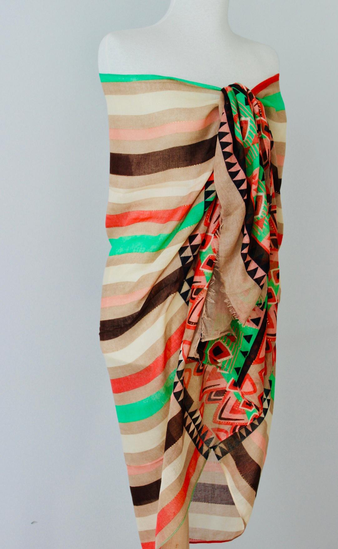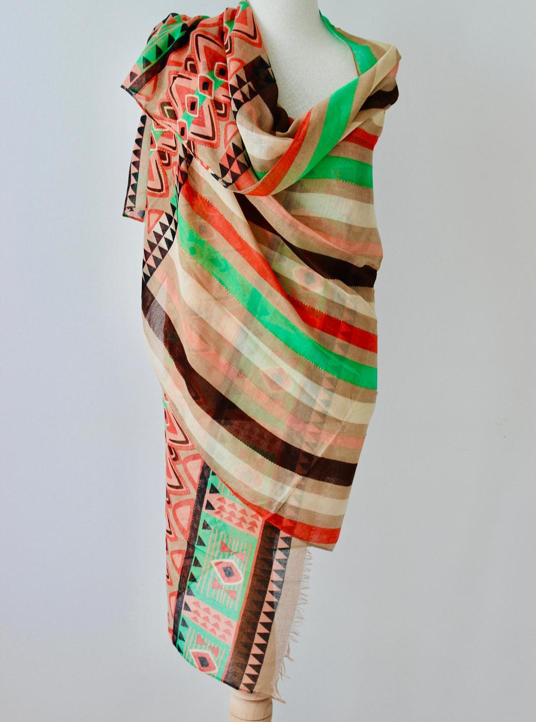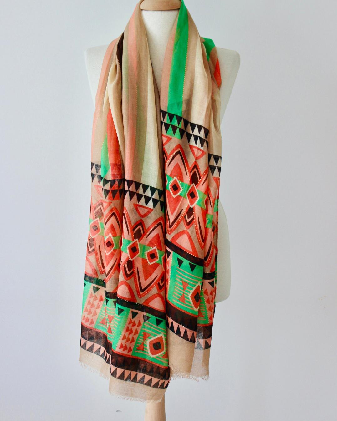 Add effortless boho style to your look with this beige shawl wrap featuring a bold Southwestern-inspired geometric pattern in warm tones. The soft, lightweight drape makes it an easy layering piece for year-round wear—perfect as a scarf, shoulder wrap, or travel essential for cool evenings.
