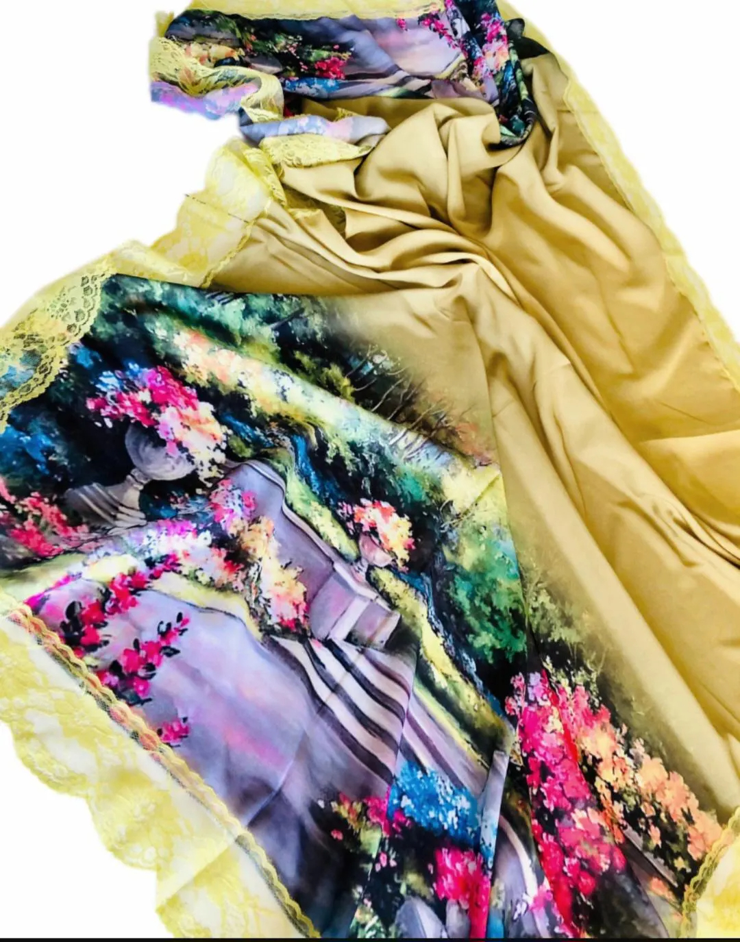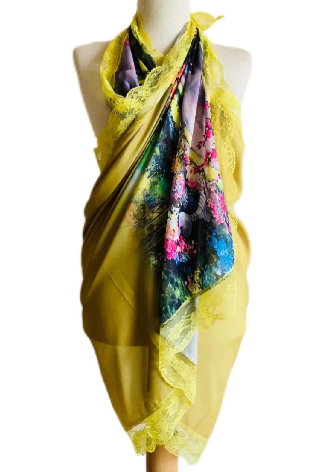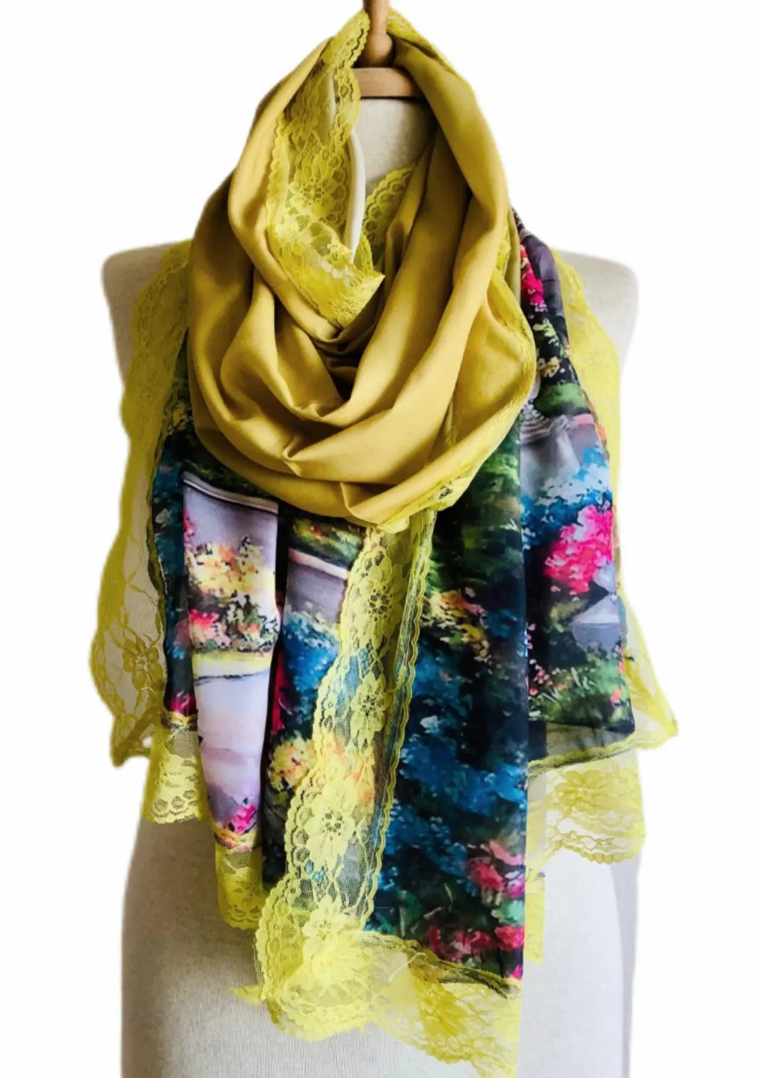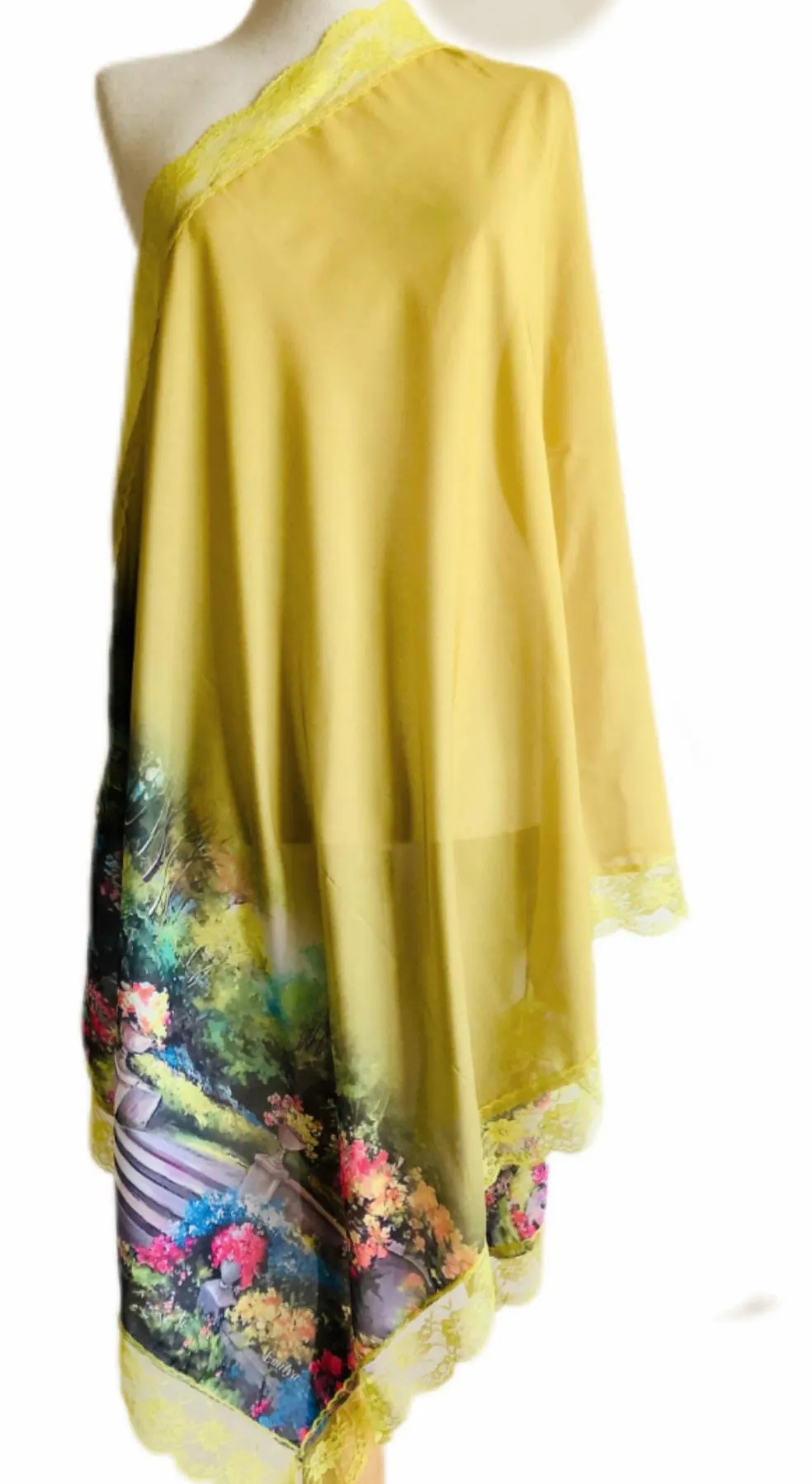 Elevate your look with this olive green shawl featuring a vibrant floral scenic print and delicate lace-trim edging. Designed for graceful coverage, it drapes beautifully as a headscarf or shoulder wrap, blending classic elegance with romantic color—perfect for modest wear, special occasions, and everyday layering.