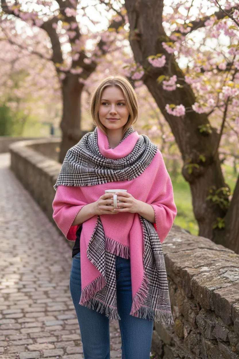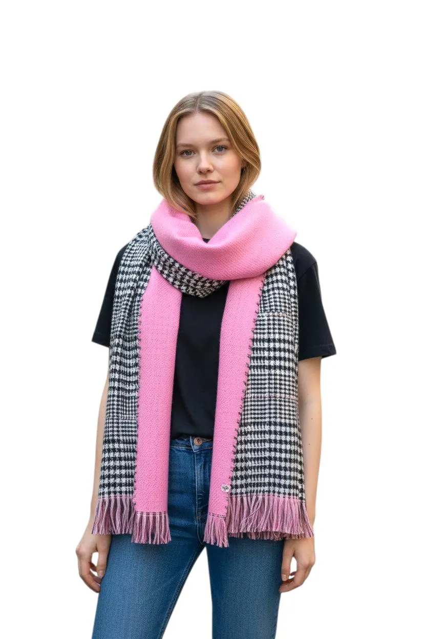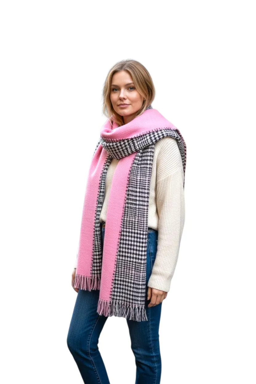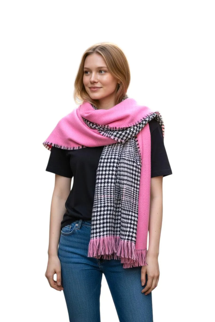 Stay warm in classic style with this pink and black houndstooth scarf. Designed with a bold two-tone contrast and finished with soft fringe, it adds instant polish to coats, sweaters, and everyday fall/winter outfits. The cozy drape makes it perfect for commuting, travel, and chilly outdoor walks.