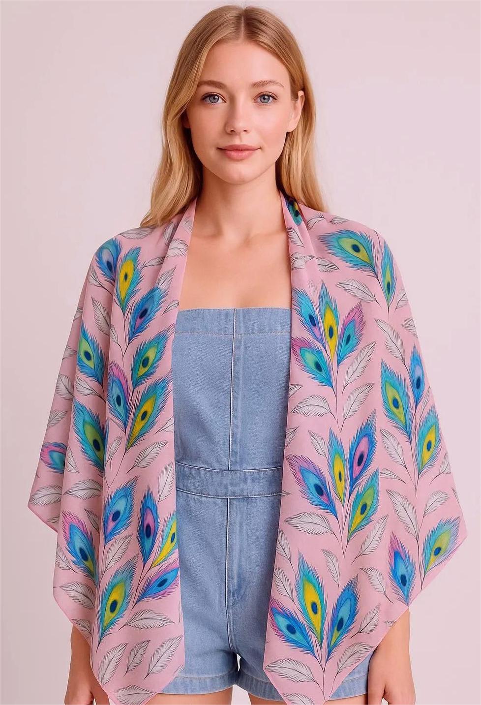 Add a bold, breezy statement to any outfit with this pink kimono-style cover-up featuring a vibrant peacock feather print. The airy drape and relaxed open-front design make it an easy throw-on layer for beach days, vacations, festivals, and everyday styling—effortless, flattering, and photo-ready.