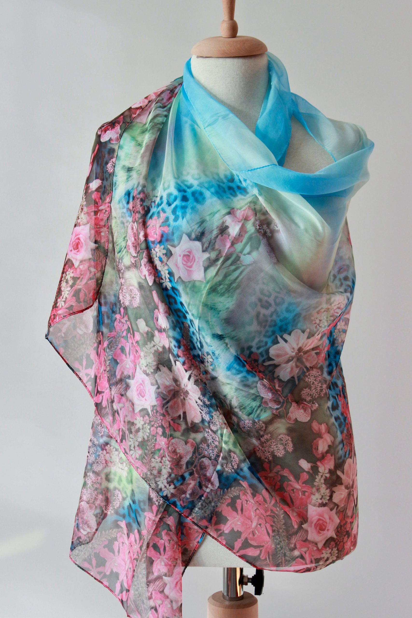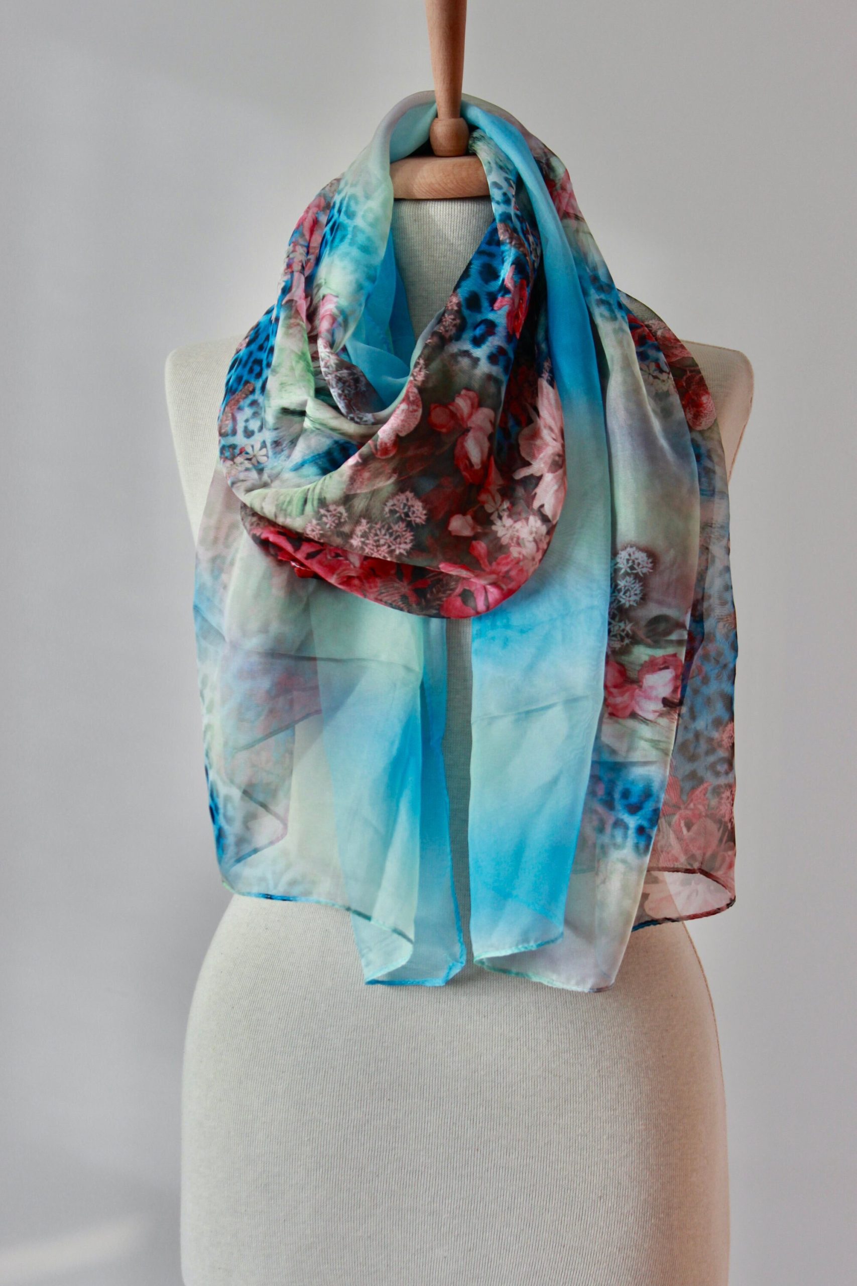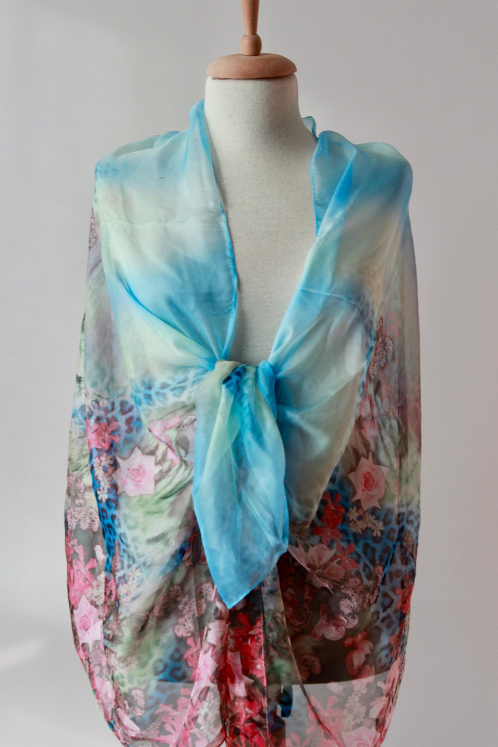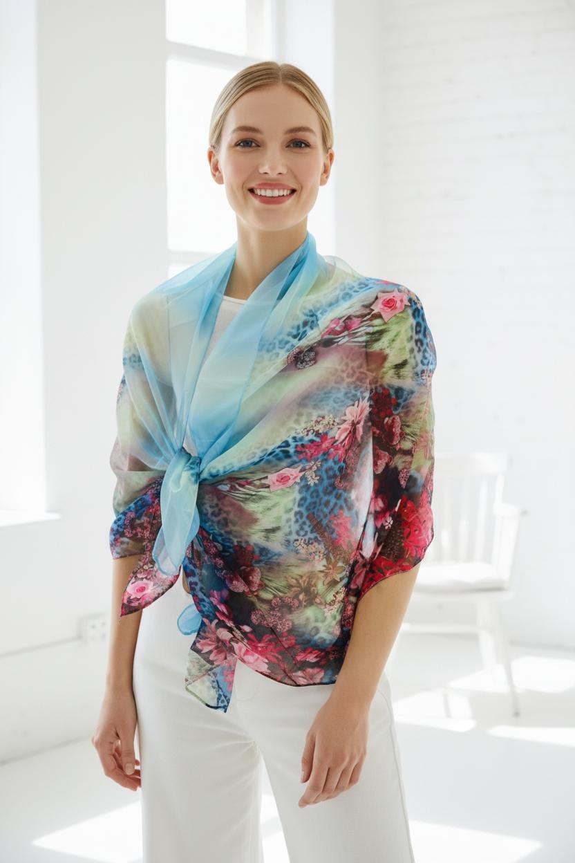Add soft color and romantic detail to any look with this sky blue sheer shawl featuring a dreamy ombré fade and a rich floral print border. The lightweight, airy fabric drapes beautifully over the shoulders for elegant coverage without bulk—perfect for weddings, evenings out, vacations, and cool indoor spaces.