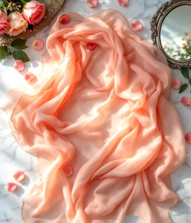 Wrap yourself in airy elegance with this peach-toned sheer chiffon shawl. The lightweight, translucent fabric drapes beautifully for a soft, romantic lookâperfect over dresses, formalwear, or casual outfits when you want a refined finishing layer without bulk.